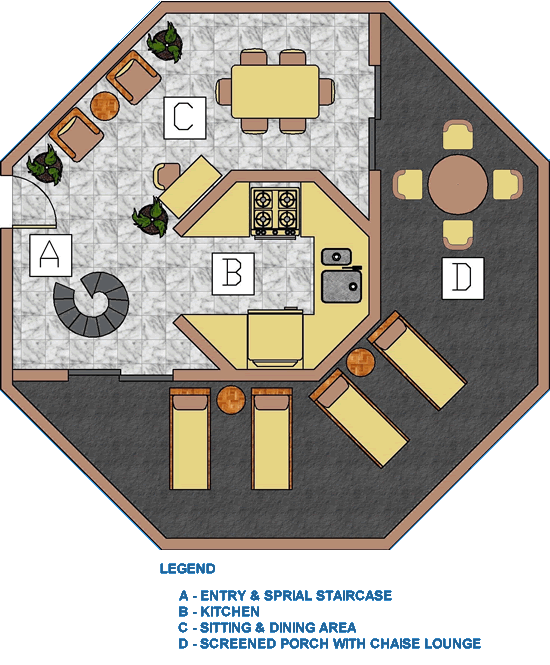 The entry level (starting on the second floor, accessed by external stairs) contains the kitchen, dining room (seats six) and a large, screened in patio, elevated off the ground to catch the tropical breezes.