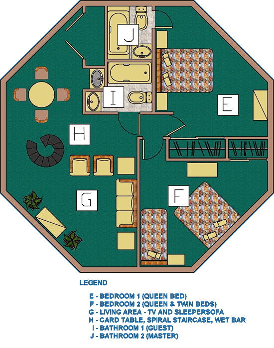The upper floor of each unit (third floor, accessed by an internal spiral staircase) contains two bedrooms, two full bathrooms and the living room. Maximum occupancy is 6 people per villa. The master suite contains a queen-size bed and private bath. The guest bedroom contains a queen-size bed and a twin-size bed. Second full bathroom just outside the bedroom door. The living room has a queen size sleeper sofa. Every villa has a spiral staircase connecting the second and third floors.